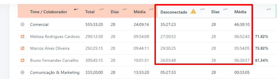 O Campo Desconectado é preenchido exclusivamente no filtro dentro da jornada. Ele exibe o tempo que o usuário permaneceu com a máquina desconectada enquanto estava dentro da jornada.