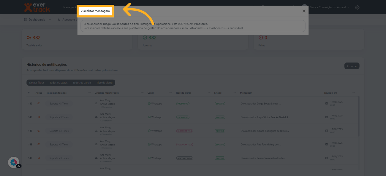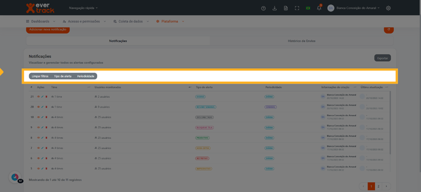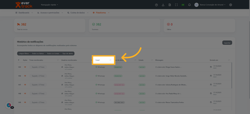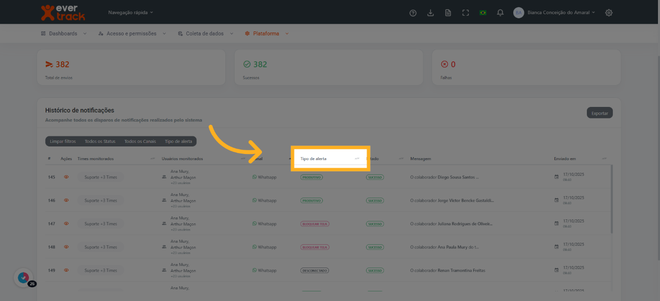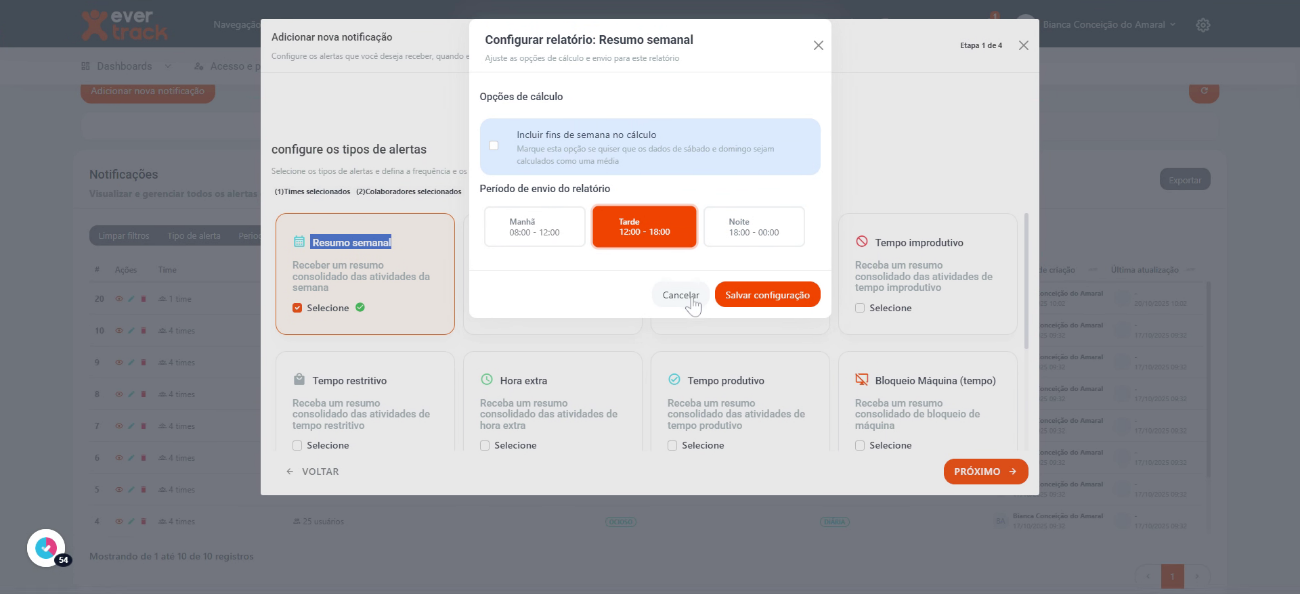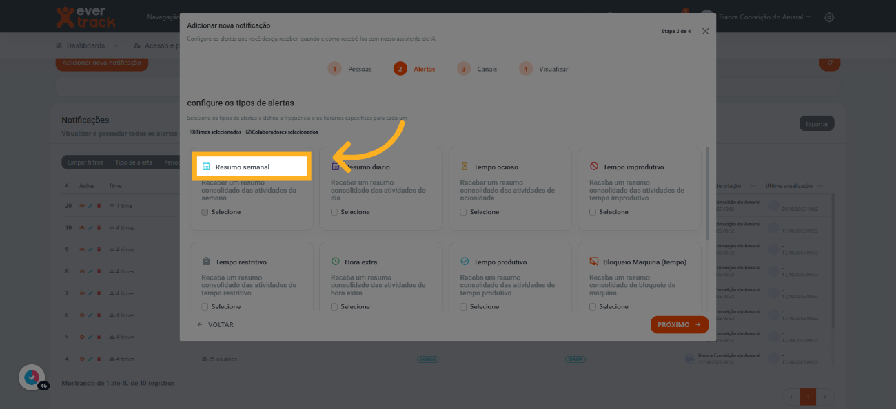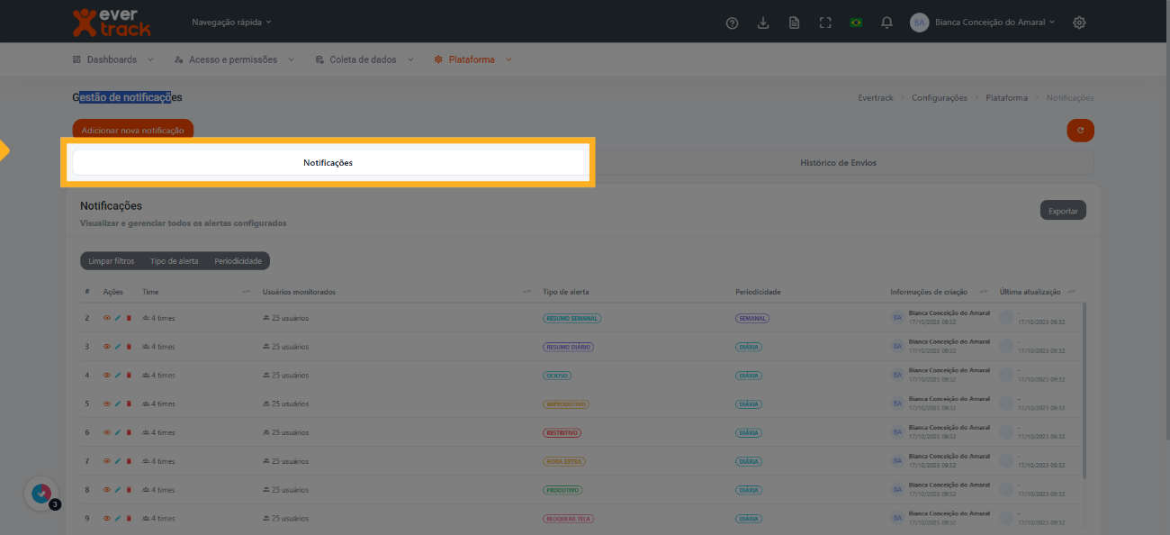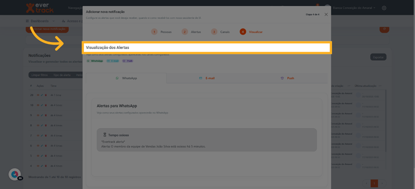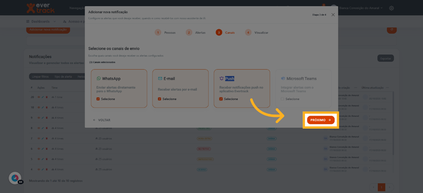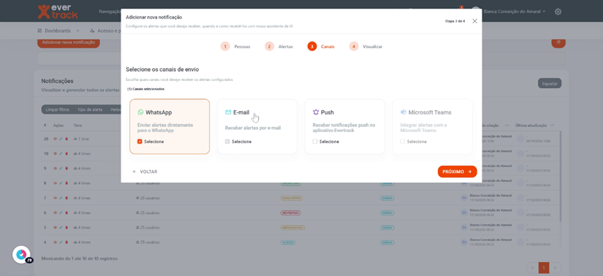 Agora temos um nova versão da tela de notificações no Evertrack, que permite configurar múltiplas notificações para acompanhar o desempenho do time. Desta tela, o usuário gerencia alertas via WhatsApp, e-mail e push, para melhor acompanhamento do dia a dia do seu time.
