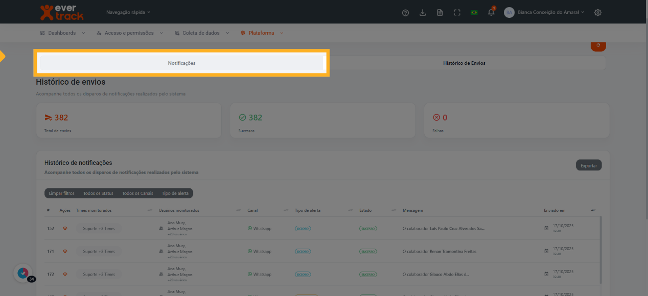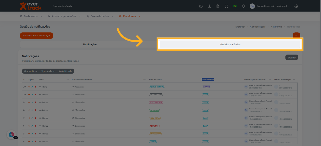 Clique "Histórico de Envios" para consultar o registro das notificações enviadas.