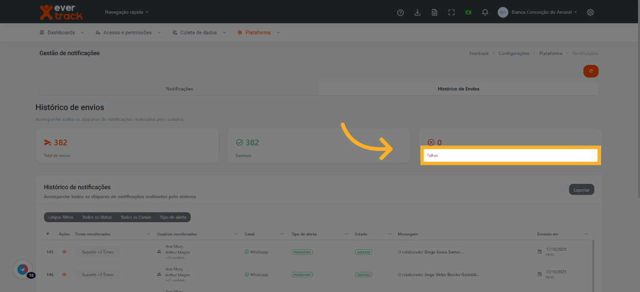 Na tela será possível acompanhar "Total de envios com falha" para verificar a quantidade total de notificações enviadas com falha.