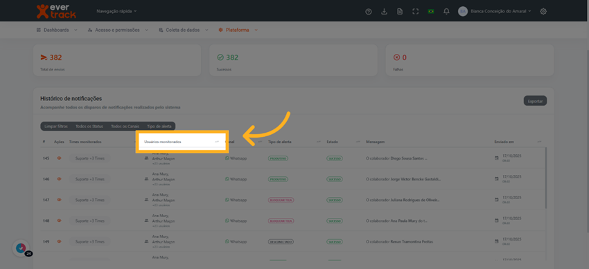 Na tabela tem a opção do campo "Usuários monitorados" para acompanhar