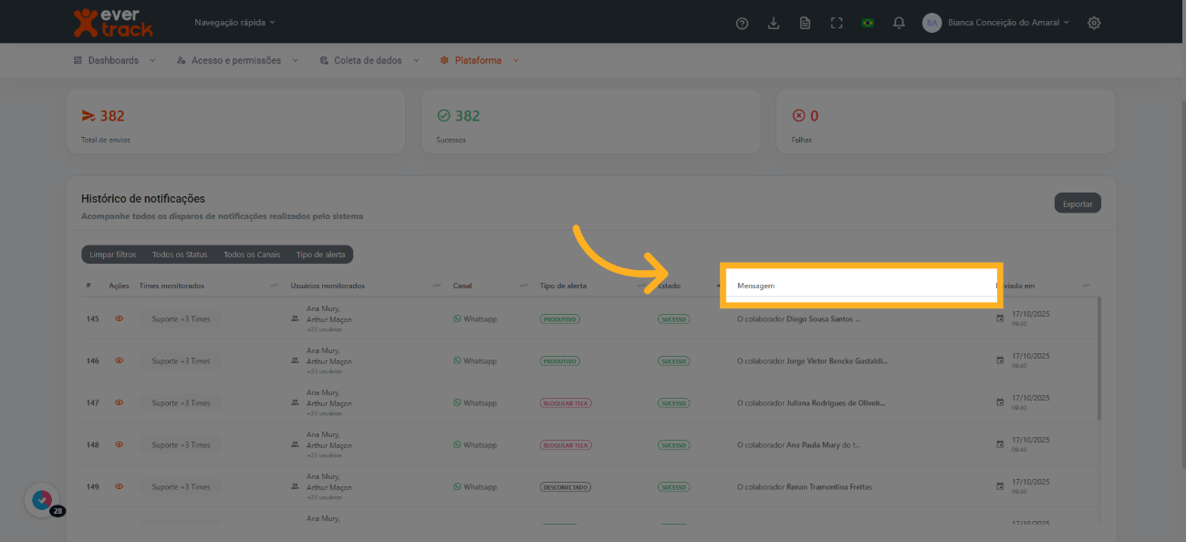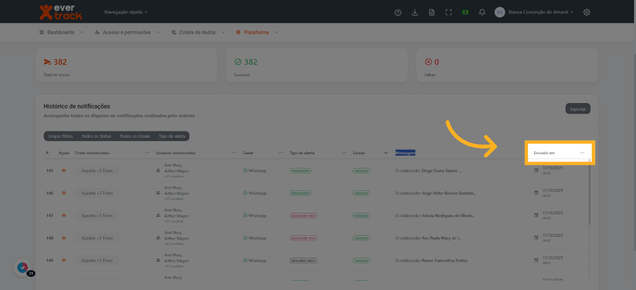 Na tabela tem a opção do campo "Enviado em" para acompanhar quando aquela notificação foi enviada