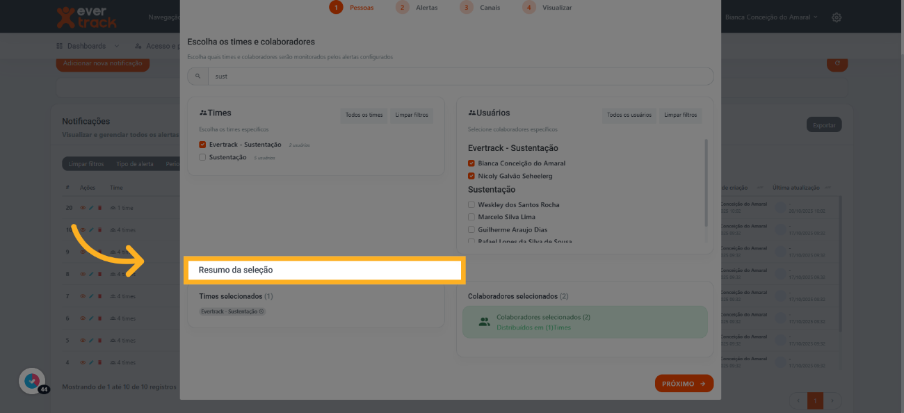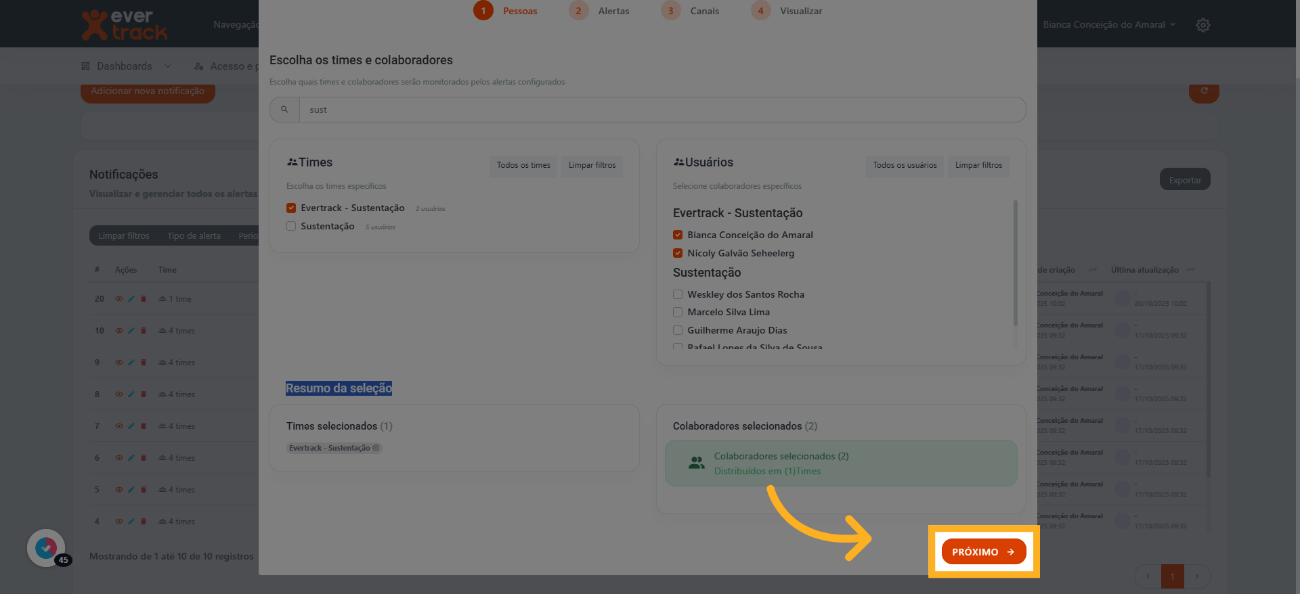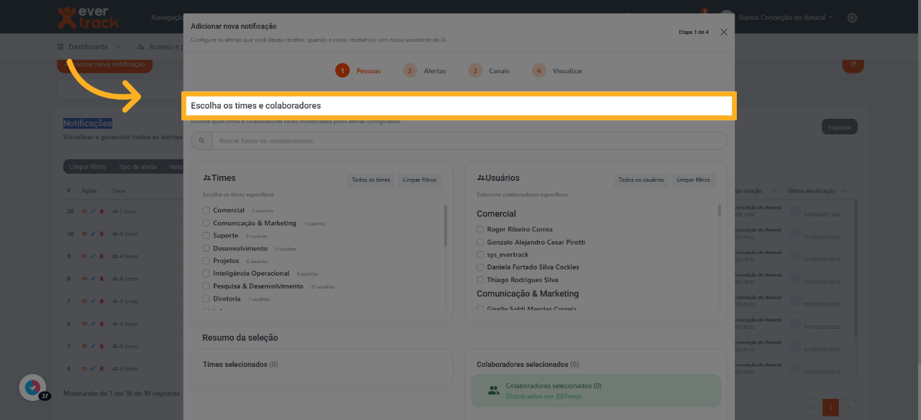 Clique "Escolha os times e colaboradores" para definir quais times e usuários deseja receber a notificação.