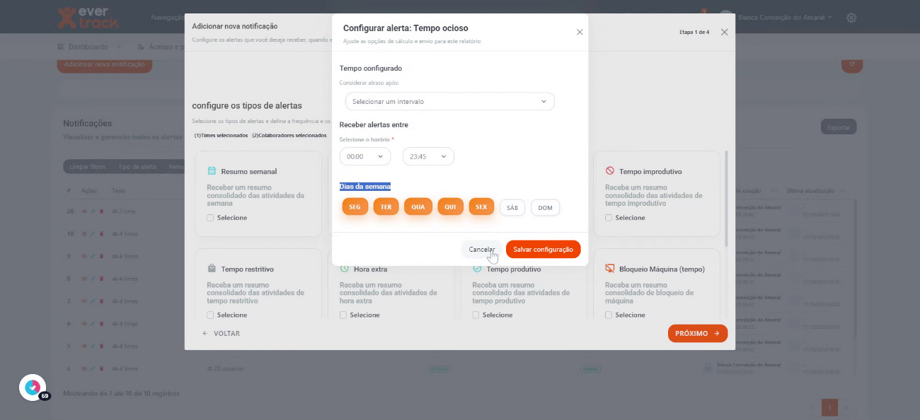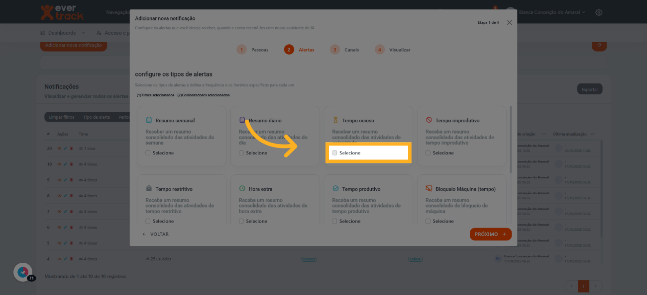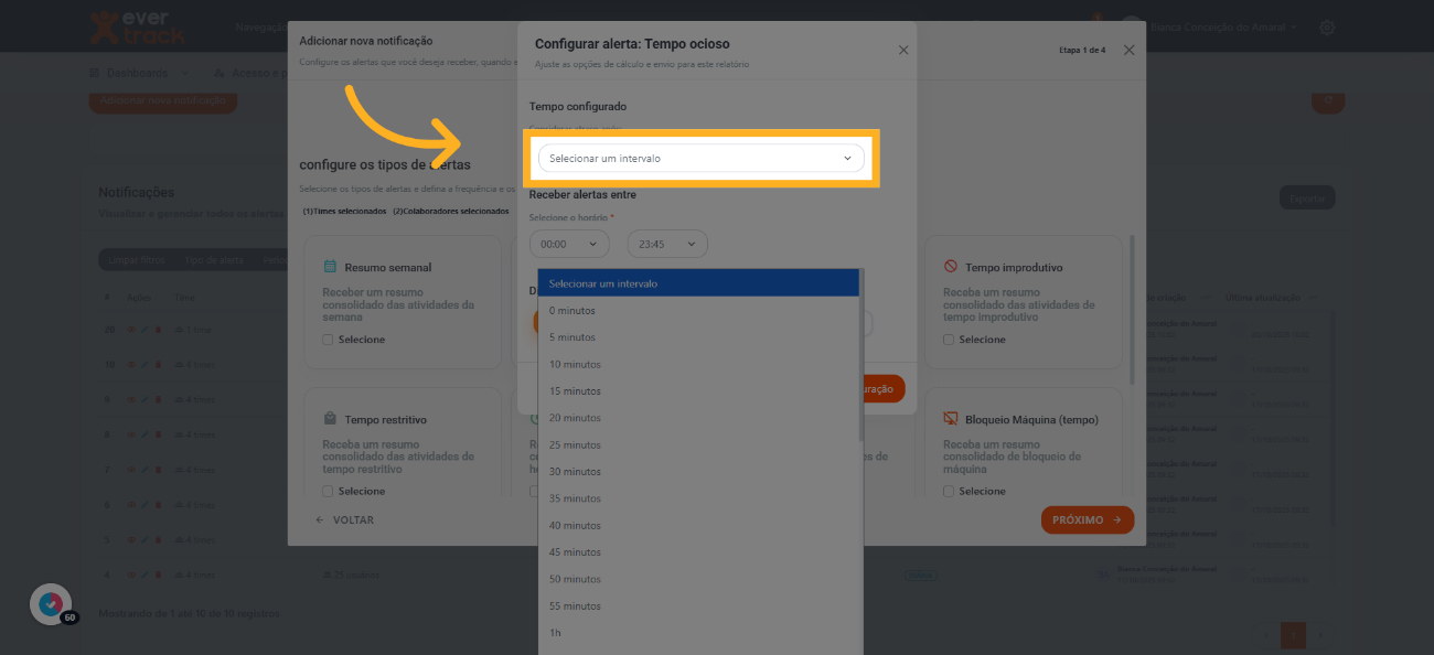 Clique na opção da categoria que você deseja configurar por exemplo ocioso e faça a seleção do "tempo configurado" a partir de quanto tempo que deseja receber a notificação, por exemplo a partir de "10 minutos" de ociosidade desejo receber a notificação