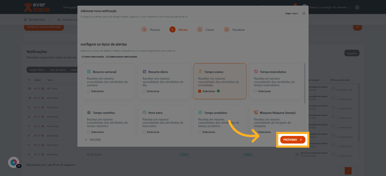 Clique "Próximo" para prosseguir com a configuração dos alertas.