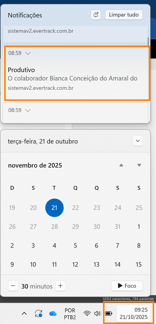 Após a ativação, as notificações serão exibidas no painel de notificações do seu computador, junto com as demais notificações do sistema (como e-mails, por exemplo), acessíveis ao clicar no relógio/data da barra de tarefas.