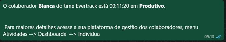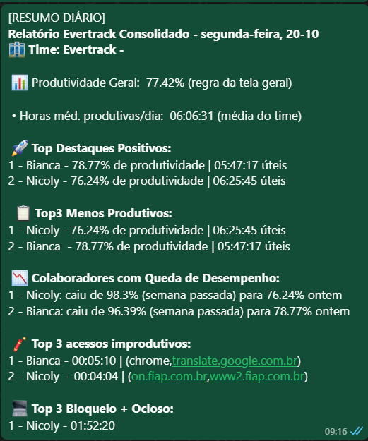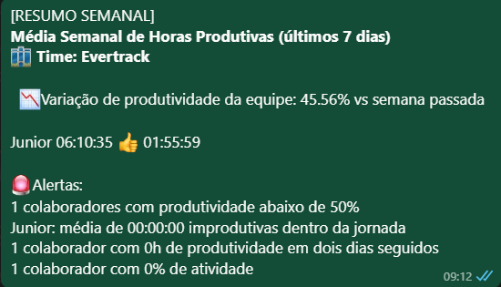 No caso do alerta de resumo semanal, a última parte — que contém os “alertas” — somente será enviada se houver colaboradores relacionados ao indicador.
