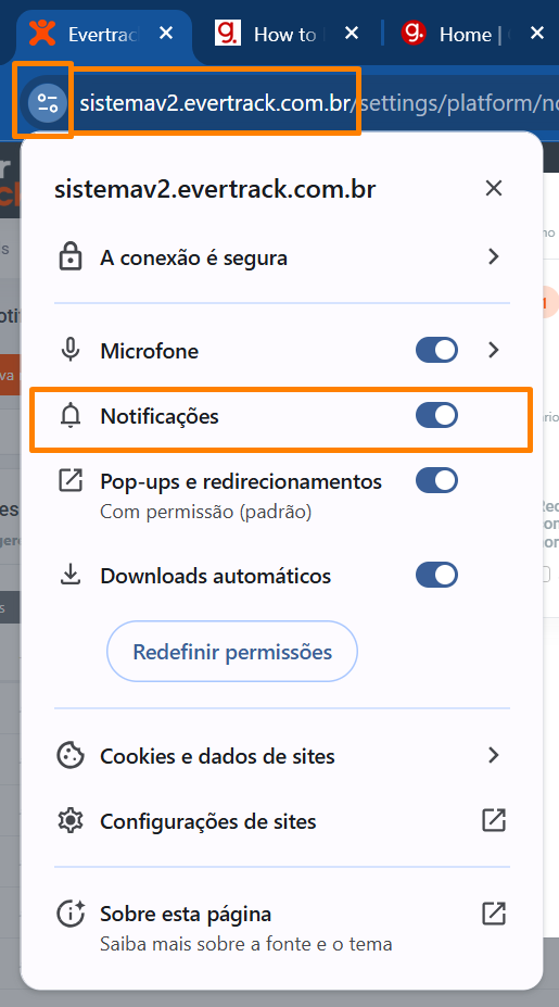 Para receber notificações push, é necessário ativar as notificações para o site sistemav2.evertrack.com.br no navegador Google Chrome, pois essa funcionalidade é vinculada diretamente a ele.