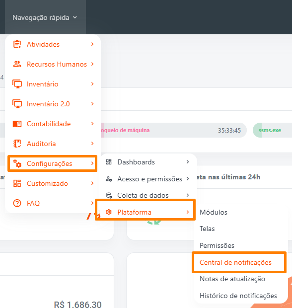 Menu: Navegação rápida > configurações> plataforma> Central de notificações Vá para sistemav2.evertrack.com.br