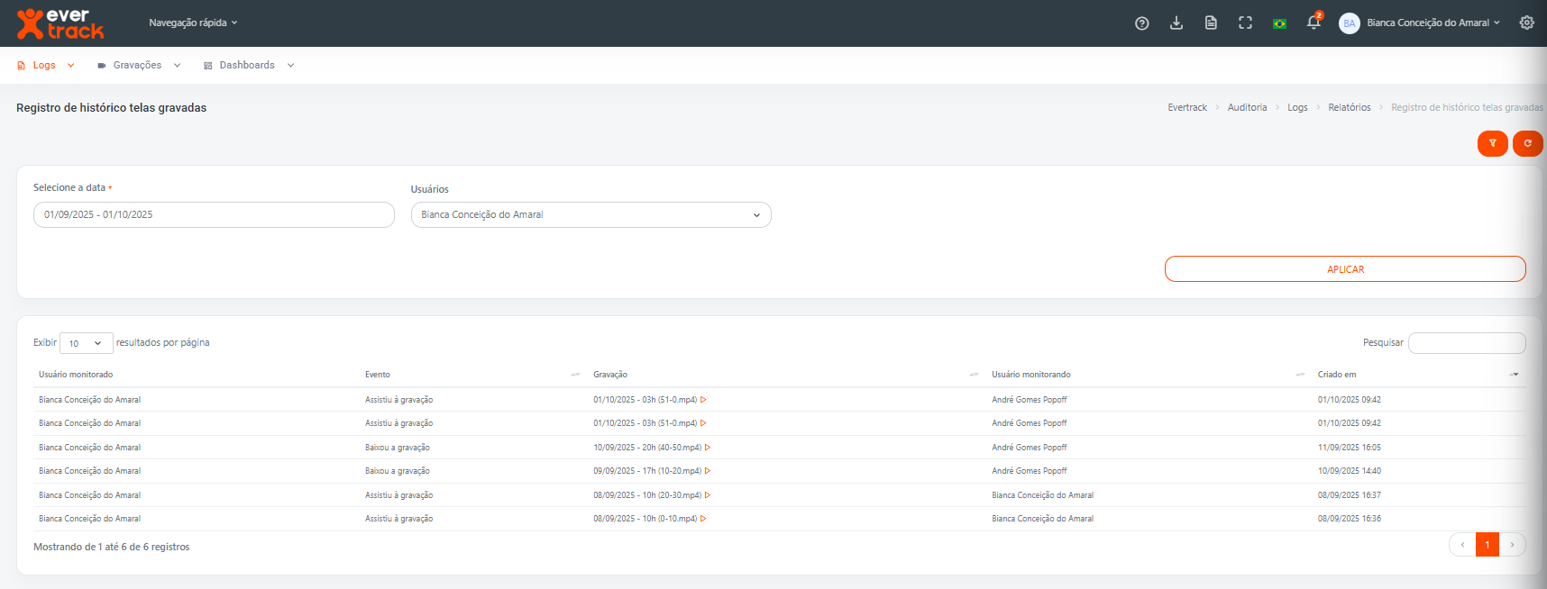 Na tela de Histórico de Gravações, é possível visualizar todas as capturas de tela realizadas de um colaborador em um período específico.