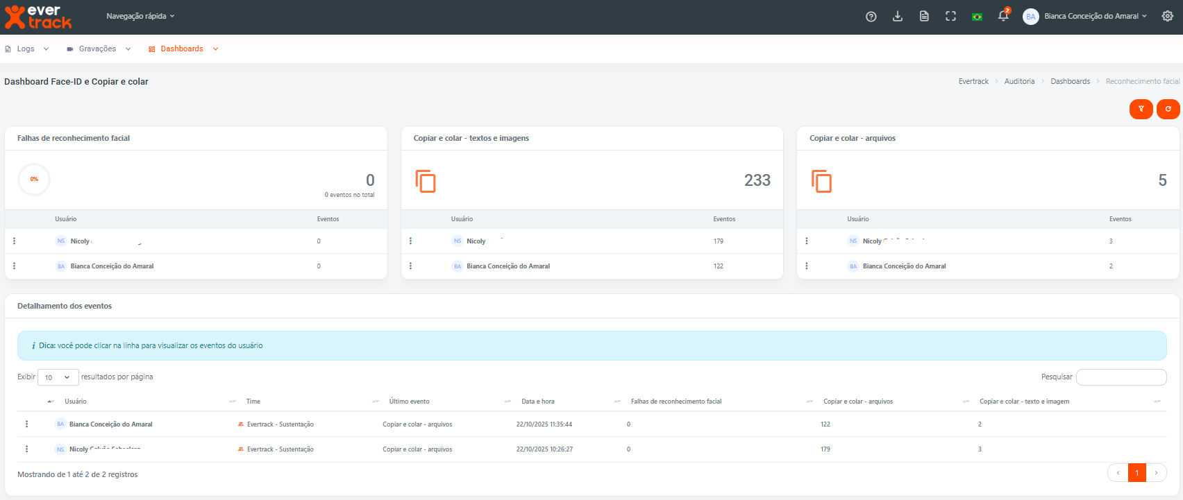Abaixo dos cards, há uma tabela de eventos detalhada, onde é possível clicar sobre o nome ou número da linha para visualizar o conteúdo copiado ou colado.