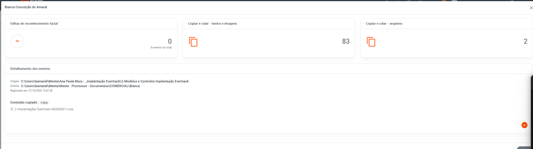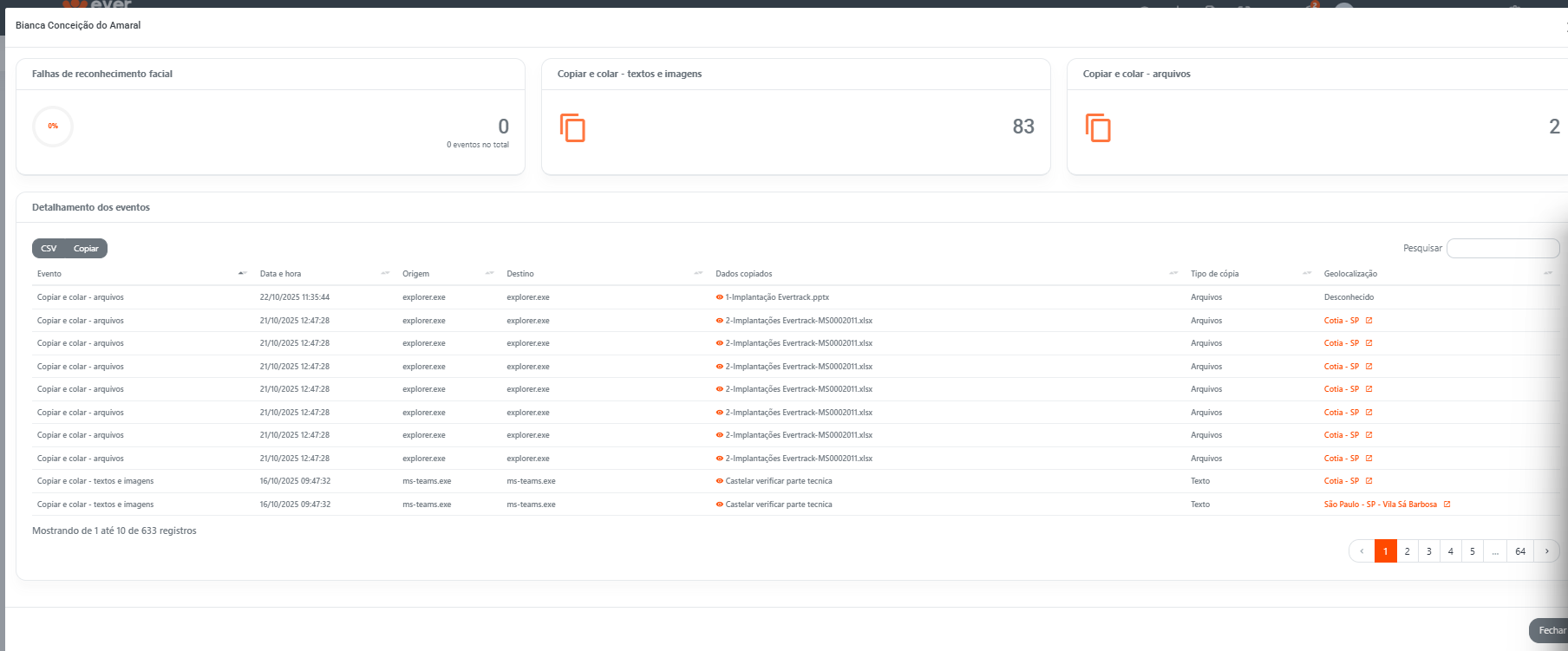 Além disso, apresenta os registros de operações de copiar e colar realizadas pelos colaboradores, permitindo monitorar tanto textos e imagens quanto arquivos.