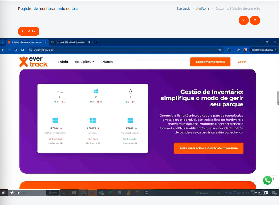 A solução de monitoramento e gravação do Evertrack é baseada em um mecanismo que captura screenshots a cada segundo, transformando-as em um streaming contínuo, semelhante a um vídeo.