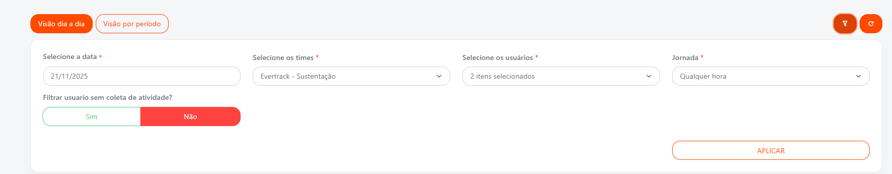 Filtrar usuário sem coleta de atividades(Disponível apenas na visão dia a dia): Esse filtro permite identificar, no dia selecionado, quantos usuários estiveram online e quantos não tiveram nenhuma coleta registrada.