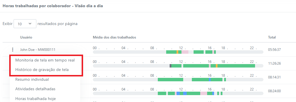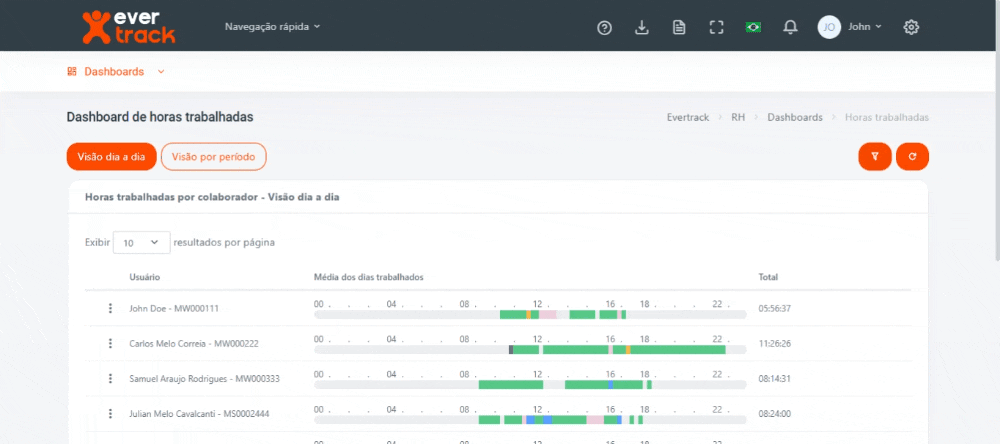Mostra a linha do tempo de um único dia por colaborador, permitindo acompanhar detalhadamente o desempenho diário.